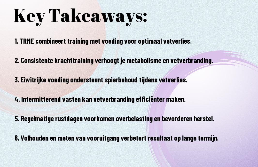 Het toepassen van de effectieve strategieën van TRME kan werkelijk een gamechanger zijn in jouw vetverliesreis. Door je te richten op zowel de fysieke als mentale aspecten van afvallen, bereid je jezelf voor op duurzaam succes. Je hebt geleerd hoe je je dieet kunt optimaliseren, je training kunt afstemmen op je persoonlijke doelen en je mindset kunt versterken om obstakels te overwinnen. Dit holistische perspectief zorgt ervoor dat je niet alleen gewicht verliest, maar ook een gezonde levensstijl opbouwt die je langetermijndoelen ondersteunt.