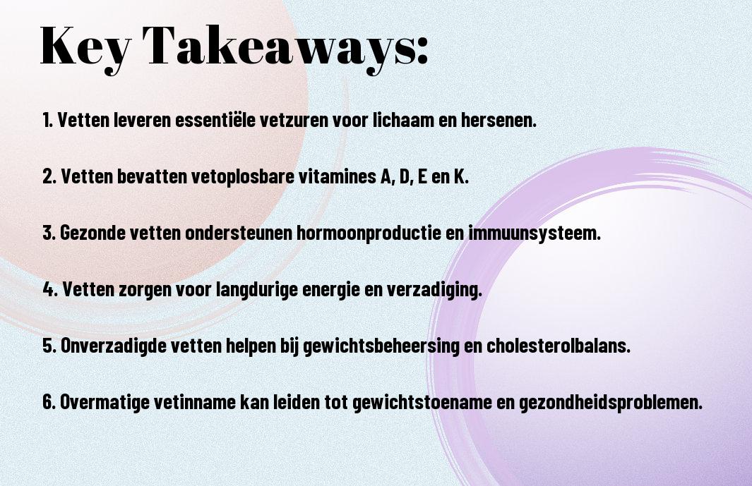• Vetten bevatten essentiële voedingsstoffen zoals omega-3 en omega-6 vetzuren, die cruciaal zijn voor de gezondheid van het hart en de hersenfunctie.